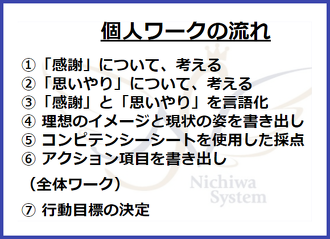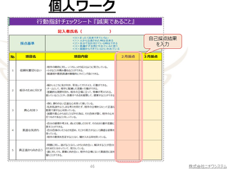 - 各人個別に「誠実」についてチェックを行い、より成長するためのポイントを決める