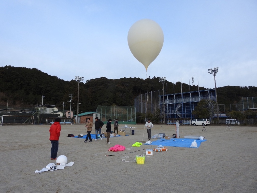 気象観測用ゴム気球(ビデオカメラ・測位計等搭載)を高知県から放球し、位置情報を取得しながら地上と通信し、機体を回収する。