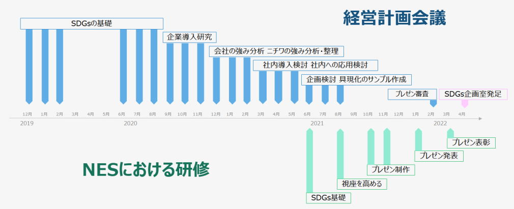 ニチワシステムでは2019年度より、経営計画会議(MPM)でのSDGsについて学びはじめ、2021年より全社員向けの研修会議(NES)で、会社全体でSDGsに取り組んでいます。